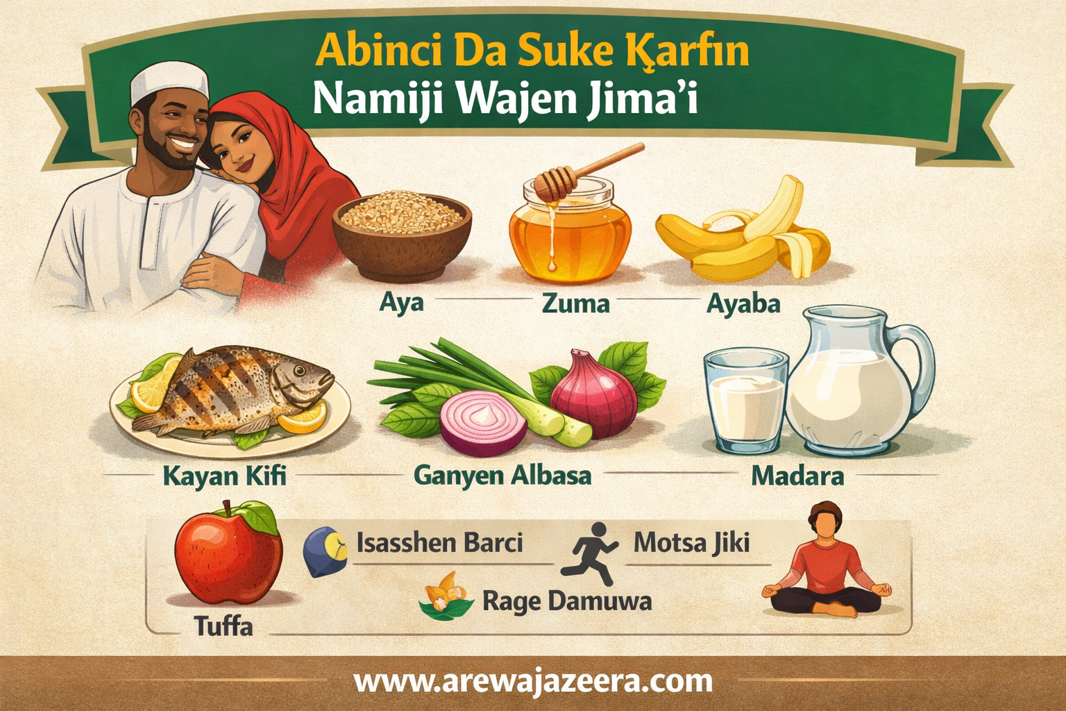 16. Ƙarfafa namiji a aure ba dole sai magunguna ba. Abinci na halitta, tare da tsari mai kyau, na iya taimakawa ƙwarai wajen ƙara kuzari, juriya, da kwanciyar hankali a rayuwar aure.