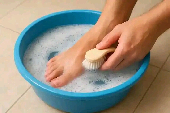 • Jiƙa kafafu a ruwan dumi – Na minti 15, sannan a goge a hankali da dutsen kafa